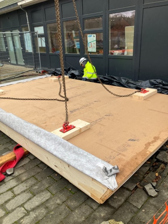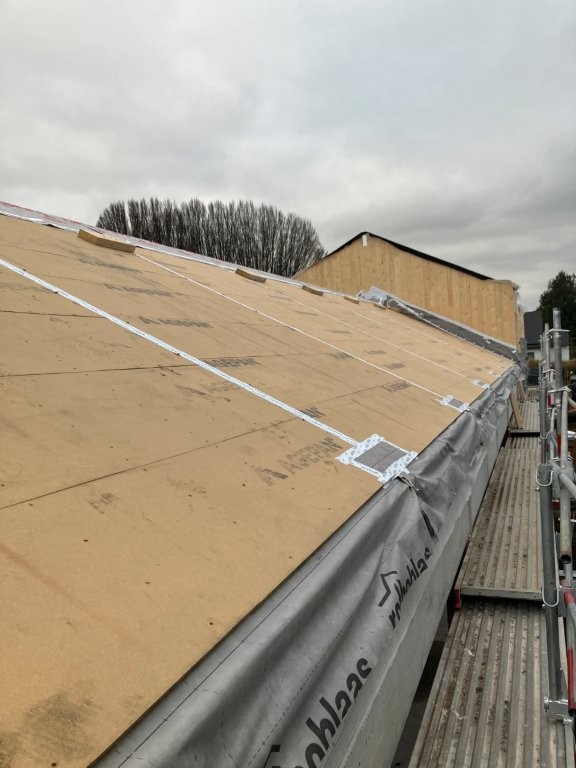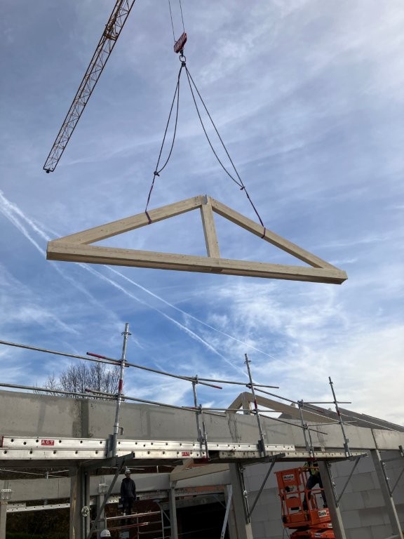 🔸 Une toiture en caissons préfabriqués, réalisés en atelier et posés sur quatre fermes en lamellé-collé livrées montées.