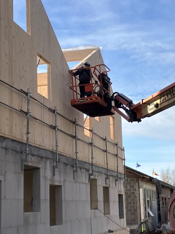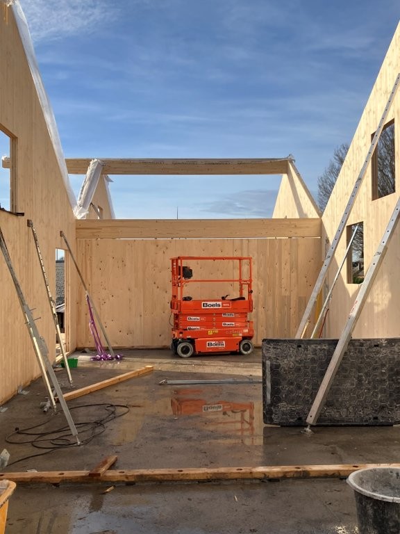 La préfabrication permet une mise en œuvre rapide, précise et protégée des intempéries, tout en offrant une finition impeccable avec des murs en CLT laissés apparents.