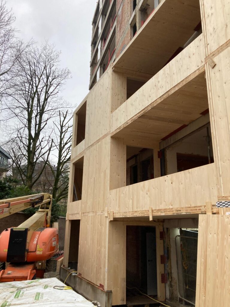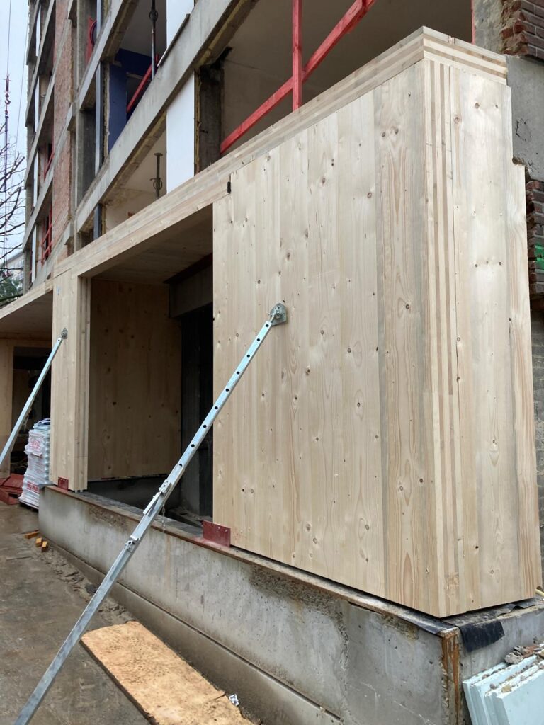 À Koekelberg, notre équipe a achevé la pose de la structure bois CLT destinée à l’extension de cet immeuble de 35 logements, marquant une étape-clé dans sa transformation.