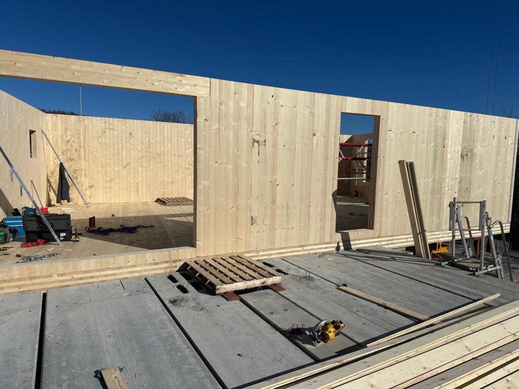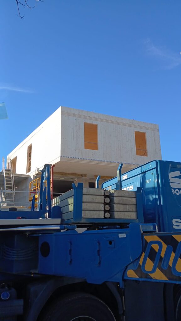 401mÂł de CLT posĂ©s sur des stepoc en tĂȘte de murs, un porte-Ă -faux de 4 mĂštres repris sur deux colonnes